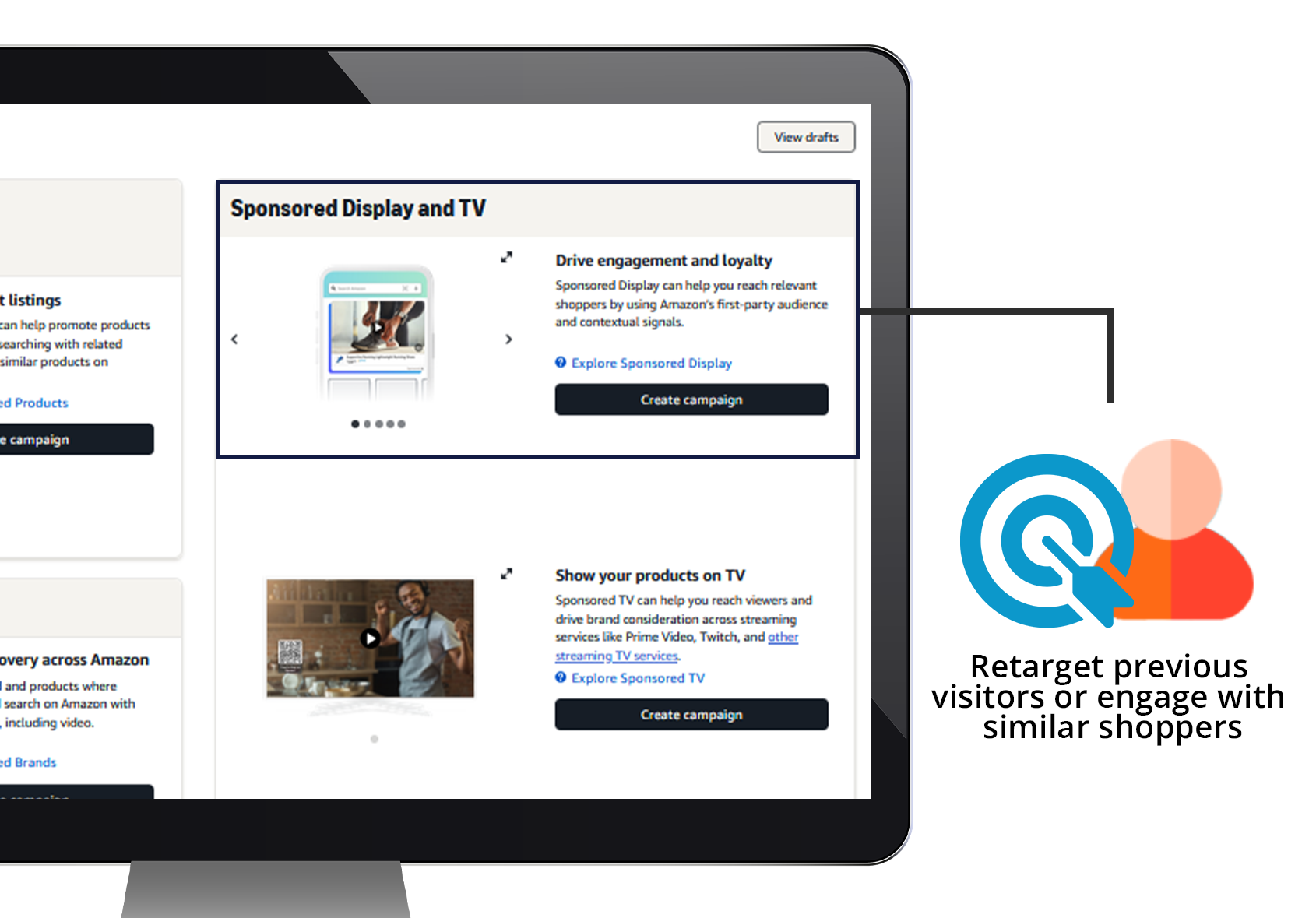 Target shoppers both on and off Amazon with display ads that appear across the web. We tailor these ads to retarget previous visitors or engage with similar shoppers.