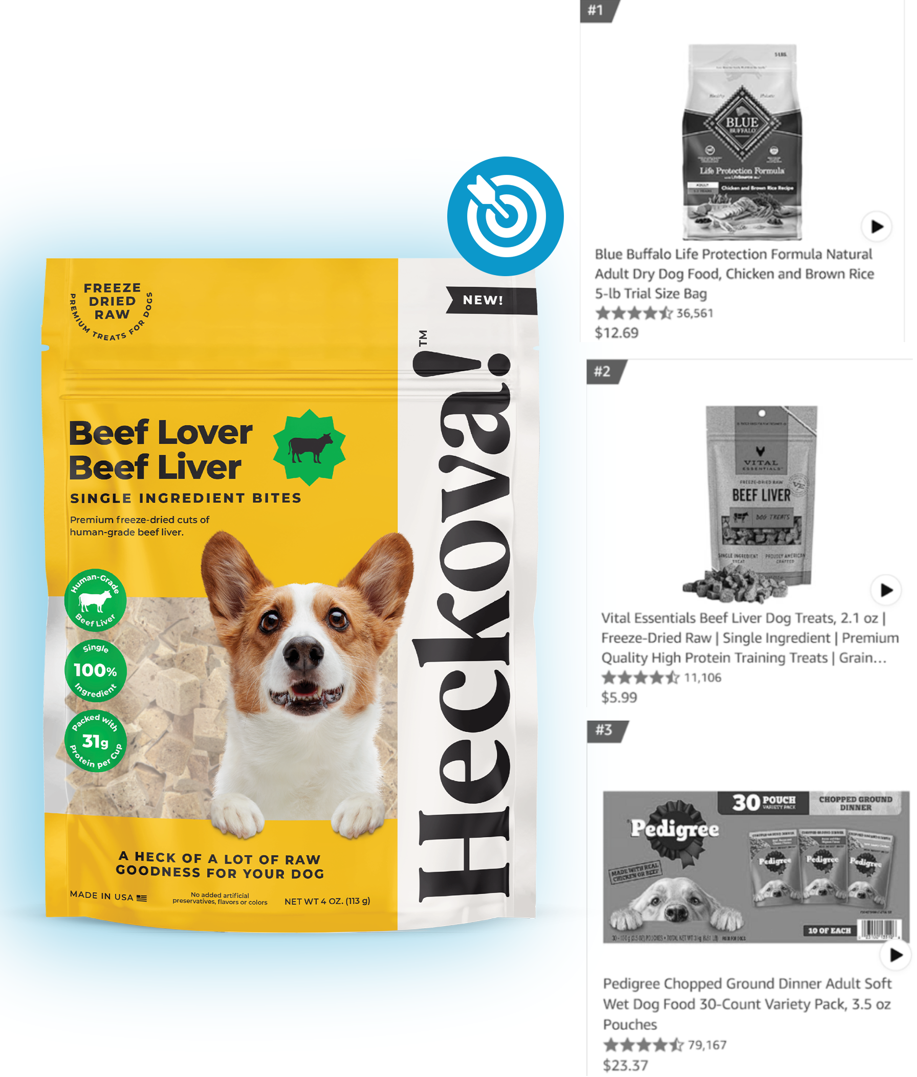 Example: A Sponsored Brands ad might showcase your best-selling products, such as “Single Ingredient Beef Dog Treats,” drawing attention to your full product range.
