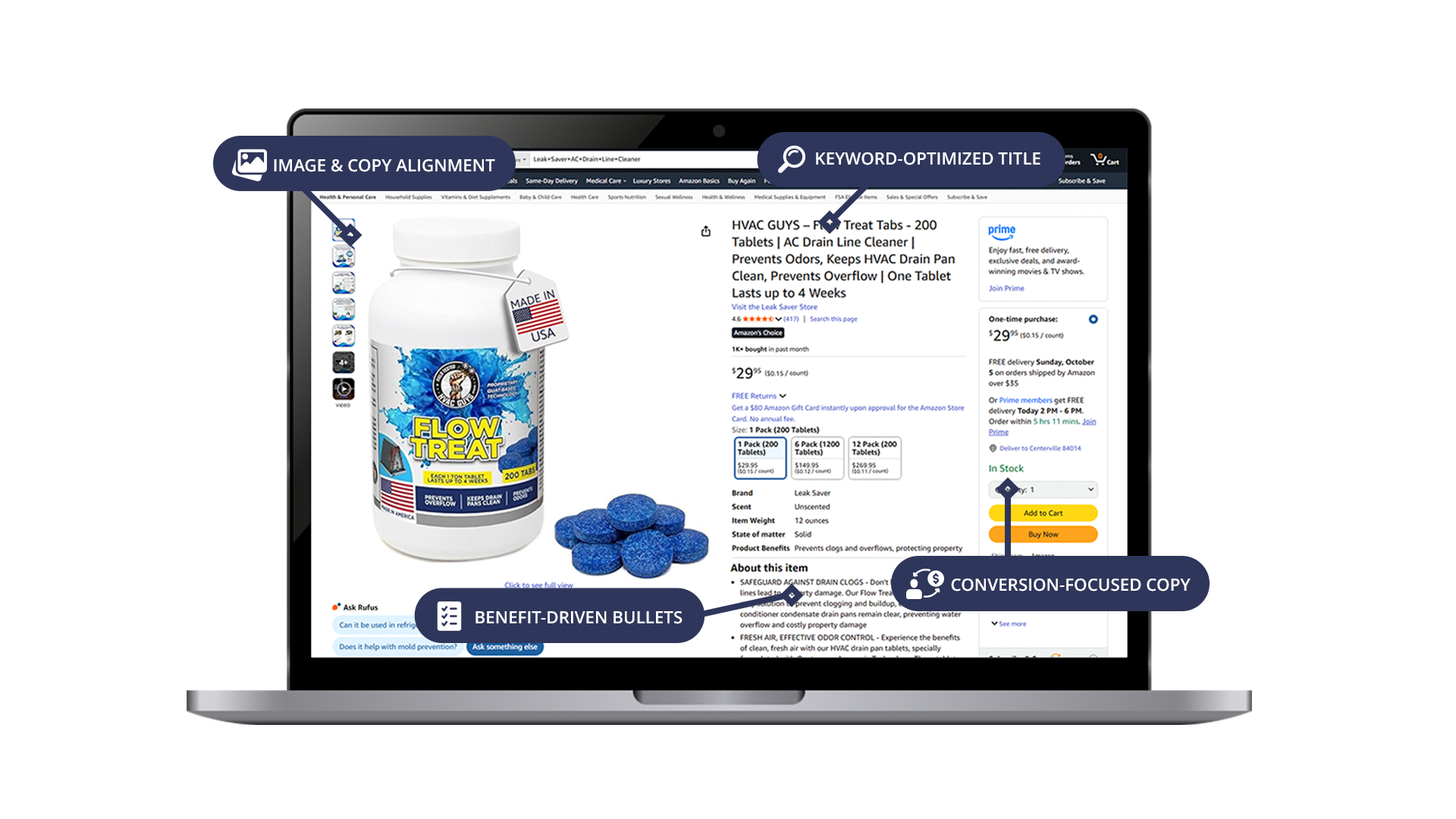 We know Amazon’s algorithm inside and out. While keywords remain critical for discoverability, Amazon now prioritizes clarity, relevance, and the shopper experience over excessive keyword repetition. Overstuffed copy not only reads poorly, it can also hurt conversions and increase the risk of listing suppression.
